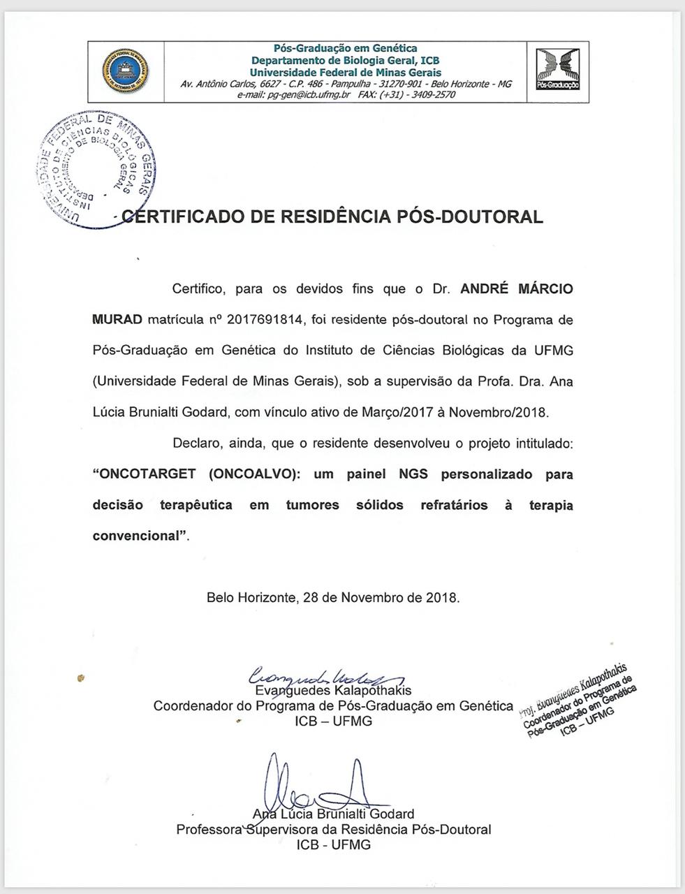 Dr André Murad concluiu seu programa de Pós-Doutorado em Genética pela UFMG e tem se dedicado intensamente às áreas de